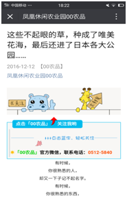 目前我们运营了两个自媒体平台,包括服务号00农品和订阅号凤凰休闲农业园00农品,用于分享飞翔农业园的最新状态和传递健康理念,每天,都有来自世界各地的农业爱好者关注我们。